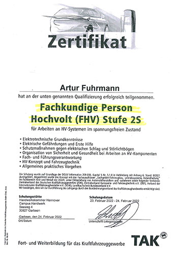 Herr Fuhrmann ist jetzt qualifizierte Person für Hochvolt (FHV) Stufe 2S